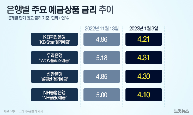 반면 한동안 대출 금리와 함께 상승하던 예금 금리는 최근 역주행을 시작해 현재 연 4%대 초반까지 떨어졌다. 일각에서는 금융당국의 무리한 금리 개입이 이 같은 상황을 초래했다는 지적이 나온다. 금융당국은 작년 11월 중순부터 은행들이 연 5%대 예금을 내놓으며 고객 유치전을 펼치자 예금 금리 인상 경쟁을 자제하도록 권고했다. 유동성이 은행으로만 몰리면 저축은행 등 제2금융권의 자금난이 우려된다는 이유에서였다. 은행들은 이런 당국의 권고를 핑계로 예금 금리는 낮추고 대출 금리는 올려 이자 수익을 극대화하고 있다.
