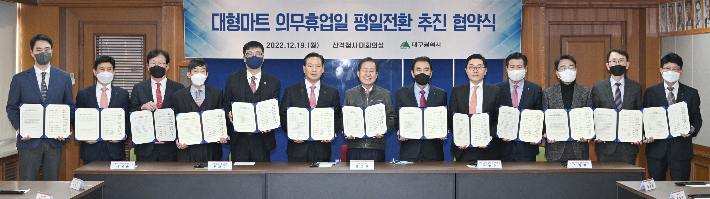 의무 휴무일 평일 전환은 지난해 12월 19일 홍준표 대구시장과 8개 구청장·군수, 전국상인연합회대구지회장,(사)한국체인스토어협회장을 비롯한 유통업계 등이 대·중소 유통업 상생발전을 위한 대형마트 의무 휴업일 평일 전환 추진 협약을 체결한 데 따른 것이다.