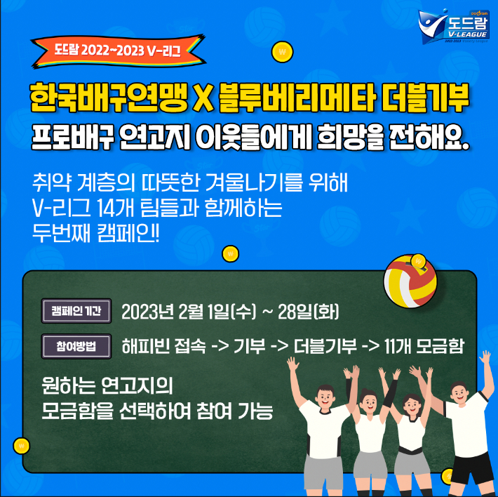 연맹은 1일 "연맹 NFT(대체불가토큰) 사업권자인 블루베리메타가 네이버 해피빈과 함께 하는 사회 공헌 기부 캠페인 2탄으로 프로배구 11개 연고지의 취약 계층 이웃들을 위한 모금 캠페인을 진행한다"고 밝혔다. 취약 계층의 따뜻한 겨울 나기를 돕고 선수와 구단, 팬들이 모두 참여하는 건강한 기부 문화 조성을 위한 기부 캠페인인데 총 3차에 걸쳐 시리즈로 진행된다.