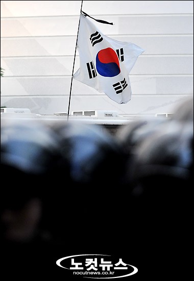 고(故) 노무현 전 대통령의 서거를 애도하는 각계의 추모 물결이 확산되고 있는 가운데 23일 오후 서울 시청 앞 덕수궁 대한문에서 진행된 ''故 노무현 전 대통령 추모 분향식''의 경찰 저지선 뒤로 검은 리본이 달린 태극기가 휘날리고 있다.