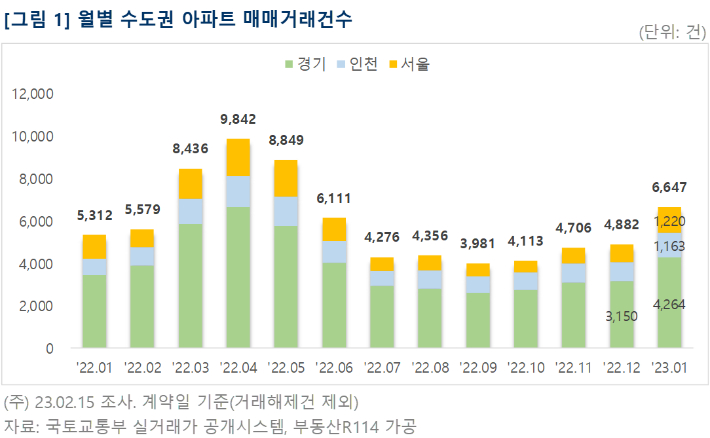 부동산R114는 국토교통부 실거래가 자료를 분석한 결과, 2023년 1월 수도권 아파트 매매계약 체결건수는 6647건으로 집계됐다고 16일 밝혔다. 서울과 인천은 작년 6월 이후 7개월 만에 1천 건 이상 매매계약이 이뤄졌으며, 경기는 지난달(3150건) 거래량보다 35% 증가한 4264건으로 조사됐다. 1월 계약분에 대한 신고기한(계약 후 30일 이내)이 아직 남아있어 거래건수는 더욱 늘어날 전망이다.