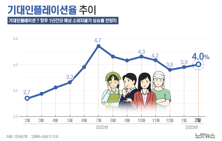 21일 한국은행이 발표한 '2023년 2월 소비자동향조사 결과'에 따르면 향후 1년간 소비자물가상승률 전망치를 나타내는 기대인플레이션율은 전월보다 0.1%포인트 상승한 4.0%로 집계됐다. 기대인플레가 4%대로 올라선 것은 지난해 11월 이후 3개월 만이다.