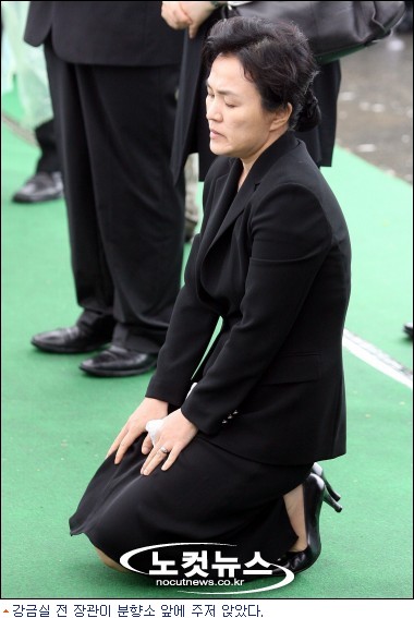강 전 장관은 24일 오후 김해 봉하마을에 마련된 분향소에 도착해 헌화했다. 흐르는 눈물을 닦으려 손에는 손수건이 쥐어져 있었다. 헌화를 마친 강 전 장관은 무릎을 꿇어 재배를 올렸다.