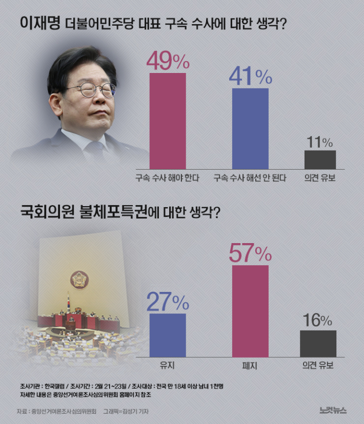 국회가 오는 27일 이재명 대표에 대한 체포동의안 표결에 들어간다. 체포동의안은 무기명 투표로 진행되며 재적의원 과반 출석에 과반 찬성으로 가결 여부가 결정된다. 의석수로 볼 때 민주당이 과반 의석을 가진 만큼 부결 가능성이 크다. 민주당은 이미 의원총회를 통해 부결표를 던지기로 총의를 모은 바 있다.