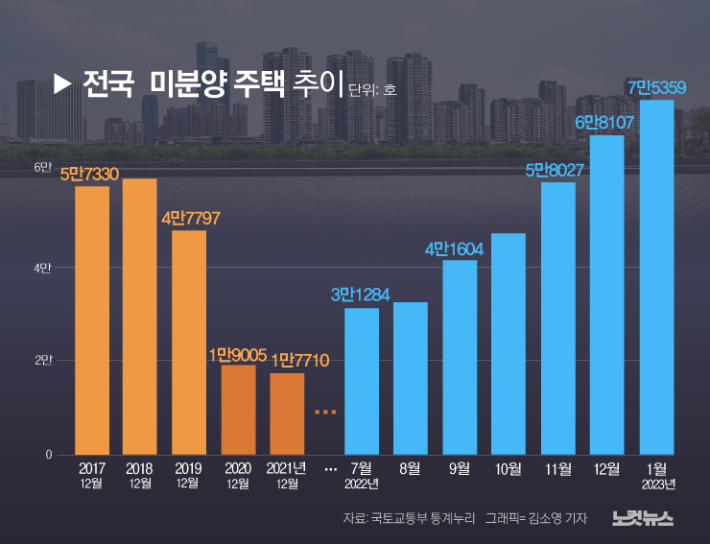 미분양 주택이 7만 5천가구를 넘어선 것은 2012년 11월의 7만 6319호 이후 10년 2개월 만이다. 다만 11월과 12월 각각 1만 호를 넘었던 증가 폭은 다소 둔화했다. 전월인 지난해 12월의 6만 8148호보다 10.6%, 7211호가 늘어났다.