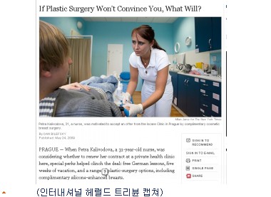 프라하의 한 개인병원 간호사를 일하고 있는 페트라 칼리보도바(31.여)는 신문과의 인터뷰에서 "재계약을 앞두고 병원측에서 공짜 독일어 강의와 5주 휴가, 가슴수술을 포함한 공짜 성형수술 가운데 선택할 것을 제안받았다"고 말했다.