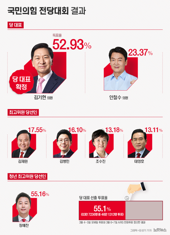 국민의힘 3·8 전당대회 당 대표 경선 결과, 김기현 후보가 52.93%로 1위를 기록했다.