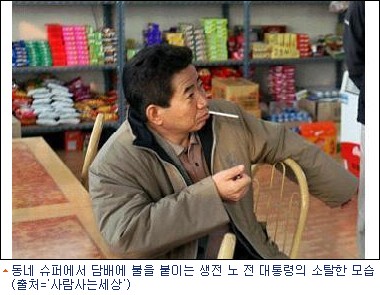 그 중에 점퍼차림으로 구멍가게에서 담배를 피고 있는 모습은 노 전 대통령에게 ''노간지''라는 별명이 붙여지게 된 인상적인 사진 중에 하나다.