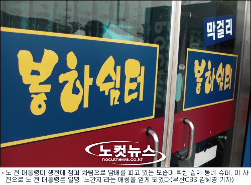 일명 ''노간지 담배'' 사진은 장소는 노 전 대통령의 사저에서 50m 정도 떨어진''봉하쉼터''로 사저에서 가장 가까운 슈퍼이다.