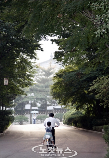2007.9.13 청와대에서 휴일 손녀와 자전거를 타고 있는 대통령