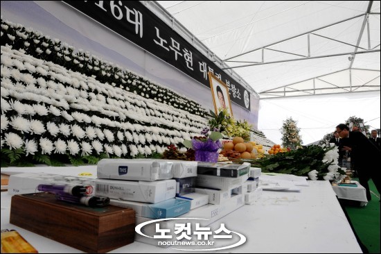노 전 대통령의 영정 앞에는 하얀색 국화 꽃이 수십만 송이 놓여졌다. 노 전 대통령이 마지막으로 찾았다던 하얀 담배도 흰 연기를 내며 소리없이 타들어 갔다. 분향소의 하얀 천막도 슬픔에 빠진 조문객들을 말없이 덮어주며 위로했다.