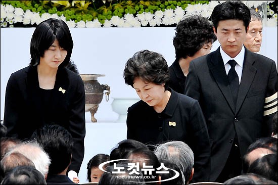 29일 오전 서울 경복궁 흥례문 앞뜰에서 거행된 고(故) 노무현 전 대통령의 국민장 영결식에서 고인의 부인 권양숙 여사와 아들 건호씨, 딸 정연씨가 헌화를 마친 뒤 침통한 표정을 짓고 있다.