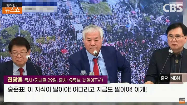 ◇ 김현정> 이 상황 속에서 당이 더 어려워진 건 뭐냐면 앞에서 유상범 의원하고도 한참 얘기했습니다만 전광훈 목사와 지도부의 갈등이 이제는 김기현 대표와 홍준표 시장 갈등으로까지 이어지는 모양새입니다. 전광훈 목사가 도대체 유튜브에서 무슨 말을 했길래 그러느냐 직접 좀 들려달라는 요청이 있어서요. 저희가 짧게 준비했거든요. 바로 문제의 발언 들어보시죠.