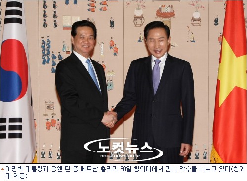응웬 총리는 이어 "한국을 친한 친구로 생각하고 금융위기에 잘 대처하고 있는 이 대통령과 한국 정부에 경의를 표한다"면서 "한국의 경제성장 경험을 배우고 싶다"고 실질적 협력 강화 필요성을 강조했다.