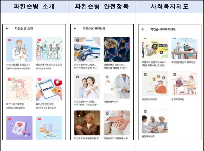 파킨슨병 관리 모바일 앱 '닥터 파킨슨'(개발책임자 가천대길병원 신경과 성영희 교수)을 공개했다. 올바른 의학정보를 쉽게 확인할 수 있도록 질병정보와 사회복지제도, 약제정보 및 주의약제 검색기능을 제공하는 플랫폼이다.