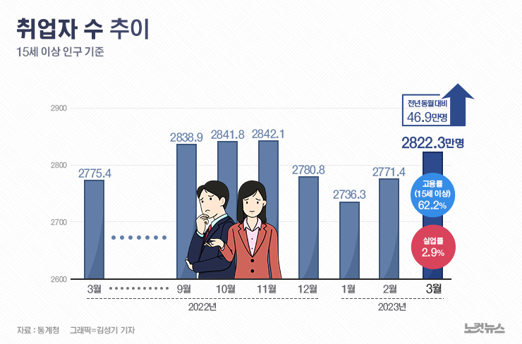 3월 취업자 46.9만명 증가…고용률 62.2%·실업률2.9%[그래픽뉴스]