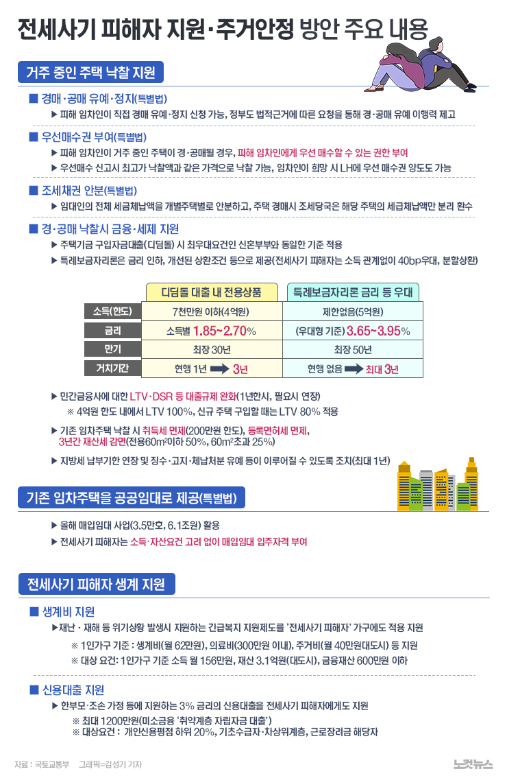 27일 정부 관계부처 합동으로 발표한 '전세사기 피해자 지원 및 주거안정 방안'에 따르면 2년간 적용되는 한시적인 특별법으로 피해자로 인정되면 먼저 직접 경매 유예·정지 신청을 할 수 있고 임차 주택이 경매로 나올 때 우선 매수할 수 있는 권한을 갖는다. 피해자가 주택을 낙찰받으면 4억원 한도 내에서 낙찰자금 전액도 저리로 대출해준다. 주택 매수를 원하지 않으면 한국토지주택공사(LH) 등 공공이 우선매수권을 넘겨받아 주택을 사들인 뒤 피해자에게 임대할 수도 있다.