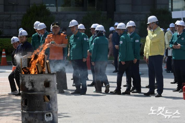 16일 정부서울청사에서 직원들이 414차 민방위의날, 민방공 대피 훈련을 마친 뒤 안전교육을 받고 있다. 6년 만에 실시되는 이번 훈련은 공습상황에 대비한 민방위 훈련으로 공공기관과 학교 중심으로 전국에서 진행됐다.