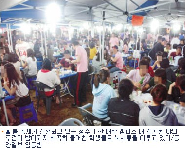 최근 대학 축제의 트렌드로 자리 잡은 술 문화와 연예인 초청 공연은 지난 3일 청주대에서도 다를 게 없었다. 게다가 공연을 보러온 고등학생들은 공연장 옆 주막으로 몰려 당당하게 술을 퍼 마셨다.
