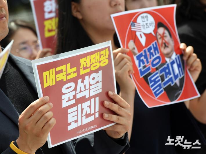 22일 오후 서울 용산구 전쟁기념관 앞에서 자주민주평화통일민족원회 관계자들이 ‘한미일 정상회담 규탄, 한미일 군사동맹 반대, 한미연합훈련 완전 중단 촉구’ 기자회견을 갖고 있다.