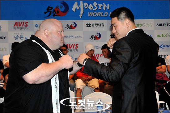 6일 오후 서울 삼성동 라마다서울호텔에서 열린 입식격투기대회 ''무신(武神)'' 기자회견에서 에릭 버터빈 애쉬(왼쪽)-송민호 선수가 포즈를 취하고 있다.