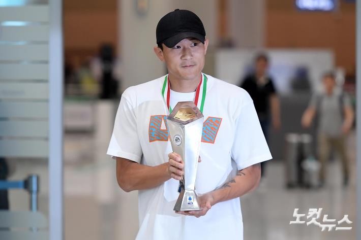 이탈리아 프로축구 세리에A 데뷔 시즌 '커리어 하이'를 찍고 최고 수비수에 등극한 '괴물 수비수' 김민재(나폴리)가 6일 인천국제공항을 통해 귀국하고 있다.