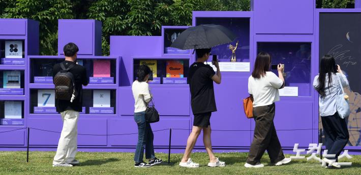 17일 오후 서울 여의도 한강공원 일대에서 진행된 방탄소년단(BTS) 데뷔 10주년 행사인 'BTS 10주년 페스타(FESTA)'를 찾은 '아미'(A.R.M.Y·방탄소년단 공식 팬클럽명)들이 방탄소년단의 디스코그래피, 수상내역, 트로피 등이 전시된 'BTS 히스토리 월' 을 관람하고 있다.