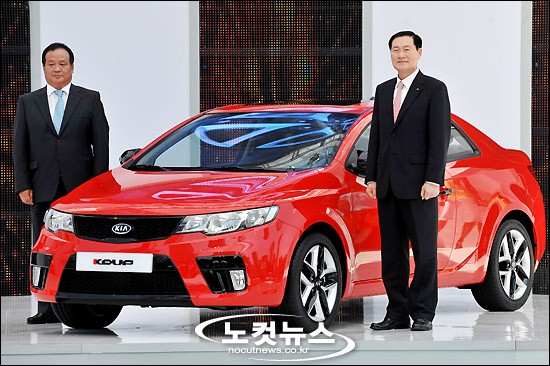 11일 오전 서울 삼성동 코엑스 앞 광장에서 열린 기아자동차의 쿠페형 세단 ''포르테 쿱(FORTE KOUP)'' 신차발표회에서 기아자동차 서영종 사장(오른쪽)과 김충호 부사장이 신차와 함께 포즈를 취하고 있다.