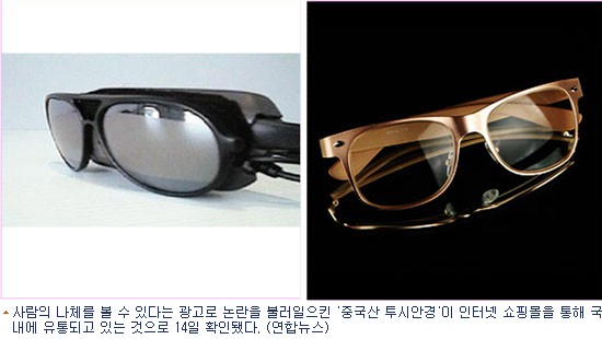 ''사람의 나체를 볼 수 있다''는 광고로 논란을 불렀던 ''중국산 투시안경''이 인터넷을 통해 국내에 유통되고 있는 것으로 14일 확인됐다.