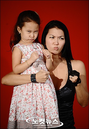 [BestNocut_R]세계적인 당구 선수 독거미 자넷리의 스타화보 현장공개가 15일 오후 강남구 역삼동의 한 스튜디오에서 진행된 가운데 자넷리가 딸 샤이엔과 함께 포즈를 취하고 있다.