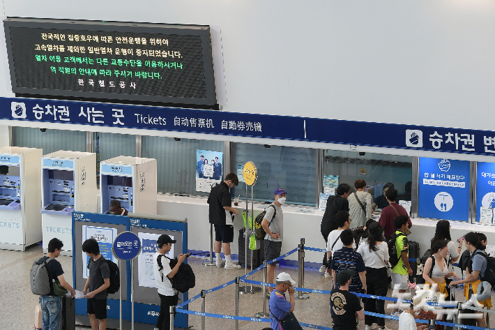 전국적으로 집중호우가 쏟아진 15일 오전 서울 중구 서울역 전광판에 집중호우로 인한 열차 운행 지연 및 중지 안내문이 표시되고 있다. 이날 한국철도공사(코레일)에 따르면 전날 신탄진~매포 구간 회송열차 궤도이탈 사고가 복구되고 집중호우가 해소될 때까지 KTX·일반열차 등 운행이 170여회 중지되고 30여회 조정된다. 박종민 기자