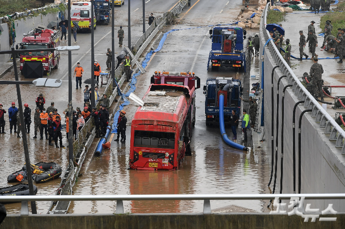 16일 미호천 제방 유실로 침수된 충북 청주시 오송읍 궁평2지하차도에서 군 장병들의 배수 작업과 동시에 119 구조대원들의 버스 인양 및 실종자 수색이 진행되고 있다. 이번 사고로 주행중이던 시내버스와 화물차, 승용차 등 차량 17대가 침수돼 모두 14명이 안타깝게 목숨을 잃고, 10명이 다치는 참사가 빚어졌다. 오송=박종민 기자