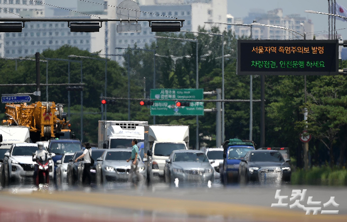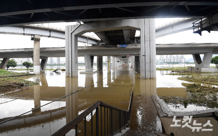 장맛비와 팔당댐 방류로 한강 수위가 높아진 17일 오전 서울 용산구 잠수교 통행이 지난주 금요일부터 나흘째 전면 통제되고 있다. 황진환 기자