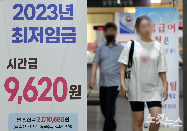 내년 최저임금 시급 9860원..1만원 돌파 무산 19일 내년도 최저임금이 시급 9860원, 월급(209시간 기준) 206만 740원으로 결정됐다. 인상률은 2.5%(올해 시급 9620원·월급 201만580원)로, 2021년 1.5% 인상을 제외하고 역대 두 번째로 낮다. 사진은 이날 오후 서울 마포구 서부고용복지플러스 센터에 세워진 2023년 최저임금 안내문. 황진환 기자
