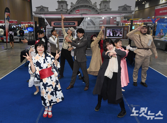 20일 오전 경기 고양 킨텍스에서 개막한 '2023 코리아 테마파크 & 어뮤즈먼트 페어(KAAFAIR2023)'에서 합천영상테마파크 관계자들이 합천놈놈놈 퍼포먼스를 선보이고 있다. 국내 유일 테마파크 산업 전문 박람회인 이 행사는 VR/AR/MR 등 증강현실 기술을 이용한 체험콘텐츠, 라이더/게임기 등 놀이기구, 드론축구, 인공암벽, 레이저태그 서바이벌 등 현장에서 관람객들이 바로 체험 가능한 다양한 전시 품목으로 구성돼 있다. 전시회는 오는 22일까지 계속된다. 황진환 기자