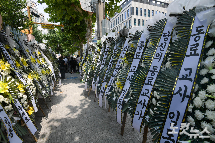 21일 오전 서초구 서이초등학교에 마련된 교사 A씨의 추모공간에 시민들이 헌화를 하고 있다. 이 사건과 관련해, 한 학부모가 '아이들 트라우마 생기니 화환을 보내지 말라'는 내용의 글을 맘카페에 올려 논란이 됐다. 현직 교사는 모바일 메신저 프로필 사진을 추모 이미지로 설정한 뒤 학부모에게 항의를 받았다는 사연을 전했다. 황진환 기자