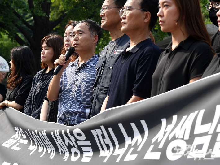 서울 서초구의 A초등학교 교사가 교내에서 극단적인 선택을 한 것으로 알려진 가운데 20일 오후 서울 종로구 서울시교육청 앞에서 해당 초등교사 유가족이 입장을 밝히고 있다. 고인의 유족은 "1학년 담임을 지원했다는 등 학교와 죽음이 연관 없다는 게 학교 입장인데 초임 교사가 업무 스트레스 많은 1학년 담임을 맡은 것 자체가 민원, 갑질, 업무 스트레스에 내던져졌다고 본다"고 비판했다. 황진환 기자