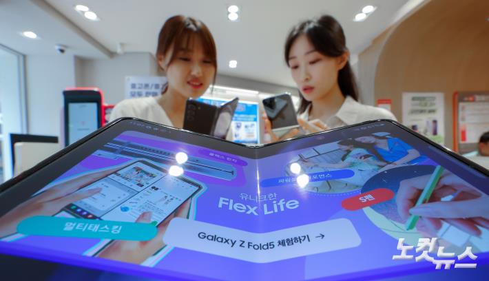 KT를 비롯한 이동통신사 3사의 갤럭시Z플립5과 폴드5의 사전 예약을 하루 앞둔 31일 오전 서울 종로구 KT 플라자 광화문역점에서 직원이 갤럭시Z플립5와 폴드5를 살펴보고 있다.