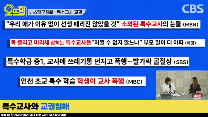 ◇ 채선아> 최근에 특수교사가 고소당한 사건이 뉴스에 많이 오르내리고 있는데 그 뉴스를 보면, 학부모와 특수교사 중에 누가 더 잘못했냐, 이렇게 여론 재판하듯이 지금 따지는 분위기가 오가고 있거든요.