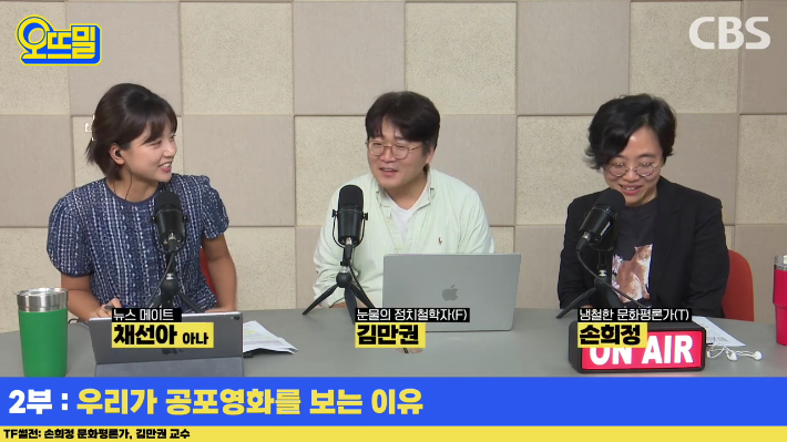 ◆ 김만권> 사실 방송 들어오기 전에 손희정 선생님과 이야기를 했었는데 저는 공포 영화를 잘 못 봐요. 엄청 무서워하고, 사실 여름에 공포 영화를 왜 보냐고 누군가 물어본다면 친구들과 가족들과 같이 가서 손잡고 볼 수 있어서, 아니면 약간 등 뒤에 숨어서 볼 수 있어서 좋아하는 거거든요.