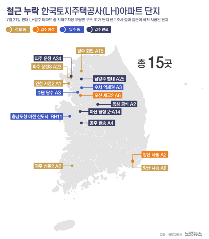 한편, 국토교통부는 지난달 31일 철근이 누락된 것으로 조사된 15개 LH 아파트 명단 등을 공개했으며 충남에서는 아산 탕정 14단지를 비롯해 공주 월송 A4와 내포 충남도청 이전 신도시 RH11 등 3곳이 포함됐다.