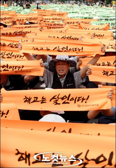 민주노총 산하 금속노조 조합원 1만여명이 19일 오후 서울 여의도 산업은행 앞에서 결의대회를 갖고 ''해고는 살인이다''라 적힌 수건을 펼치고 구호를 외치고 있다.