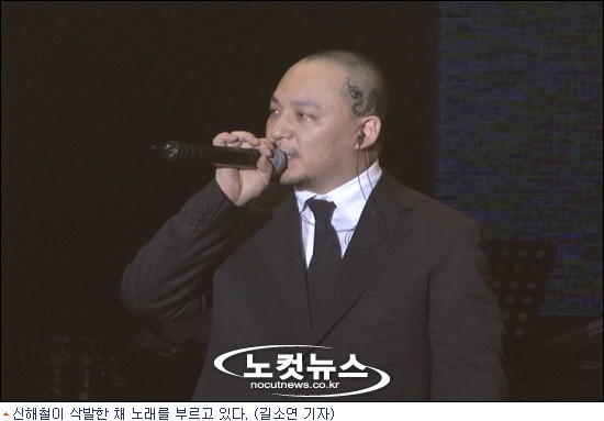 21일 노 전 대통령 추모공연 통해 공식석상 선 신해철, 삭발