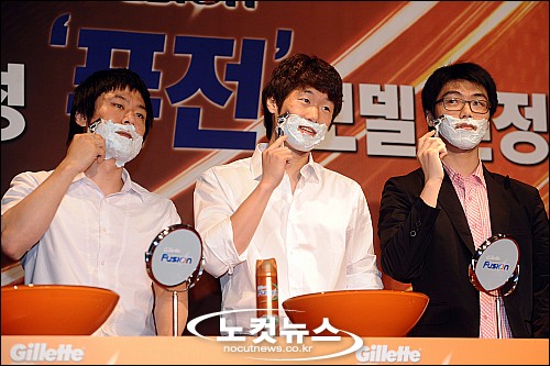 [BestNocut_R]면도기 브랜드 질레트의 ''퓨전'' 광고 모델로 선정된 축구대표팀 주장 박지성(맨체스터 유나이티드)의 모델 선정 기념식이 22일 오전 서울 한남동 하얏트 호텔에서 열린 가운데 박지성이 일반 참가자들과 함께 면도 시범을 보이고 있다.