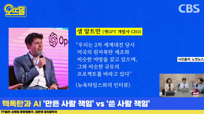 ◇ 채선아> 그래서 샘 알트만을 두고 2020년대의 오펜하이머라는 얘기도 나오고 있어요. 인공지능 기술 자체도 핵무기처럼 위험을 안고 있기 때문에 규제해야 된다는 목소리가 높잖아요.