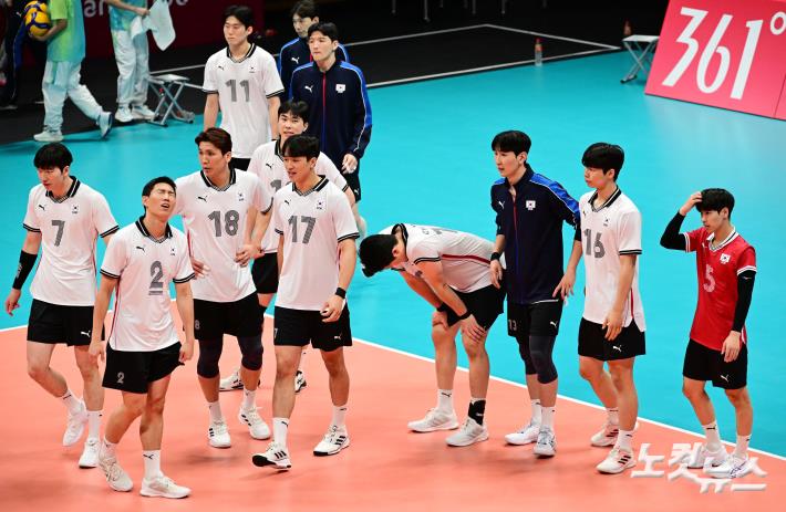20일 오후 중국 항저우 린핑체육관에서 열린 '2022 항저우 아시안게임' 남자배구 조별리그 1차전 한국과 인도의 경기에서 인도에 패한 대표팀 선수들이 아쉬운 표정을 짓고 있다.