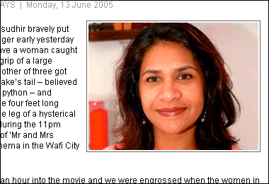 극장에 출현한 뱀을 잡아 사람을 구한 셰레나 앨랜수더씨. ('www.7days.ae'화면캡처/노컷뉴스)