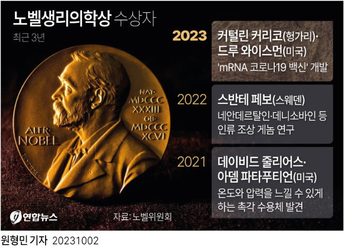 ◆ 조석영> 맞습니다. 스웨덴 현지 시각으로 10월 첫째 주 월요일부터 하루에 하나씩 발표하는데요. 첫 순서로 생리의학상 수상자가 2일에 발표됐습니다. 헝가리 출신의 카탈린 카리코 교수와 미국의 드루 와이스먼 교수인데요. 보통 과학상 수상자가 발표되면 그 업적이 무슨 소린지 이해하기 어려운데 올해 생리의학상은 들어본 얘기였어요.