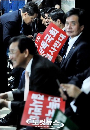 방송법을 포함한 쟁점 미디어법을 처리를 놓고 여야간 대치가 벌어지고 있는 가운데 민주당 의원들이 29일 오전 서울 여의도 국회의사당 문화체육관광방송통신위원회 회의실 앞을 점거한 채 상임위 개회를 저지하고 있다.