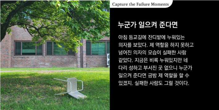 ◆ 조성호> 실패의 순간을 담았던 사진들도 전시되고 있고요. 11월 1일에는 그 말씀하신 망한 과제 자랑대회를 개최할 예정이고 마지막 날인 11월 3일에는 심리학 전공 교수님들께서 실패 관련 강연을 해 주실 예정입니다.